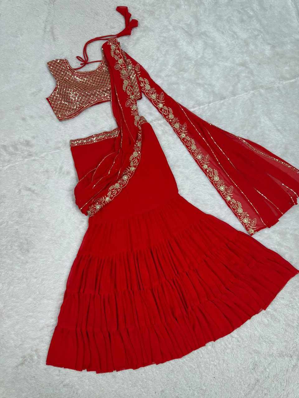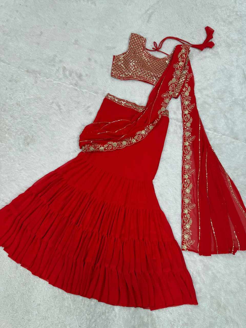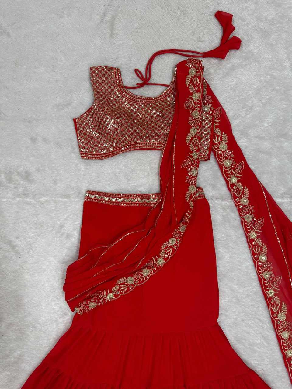 | Name : | QRC 360 Foux Gorgette thread with Sequnce Work Lehengha Saree |