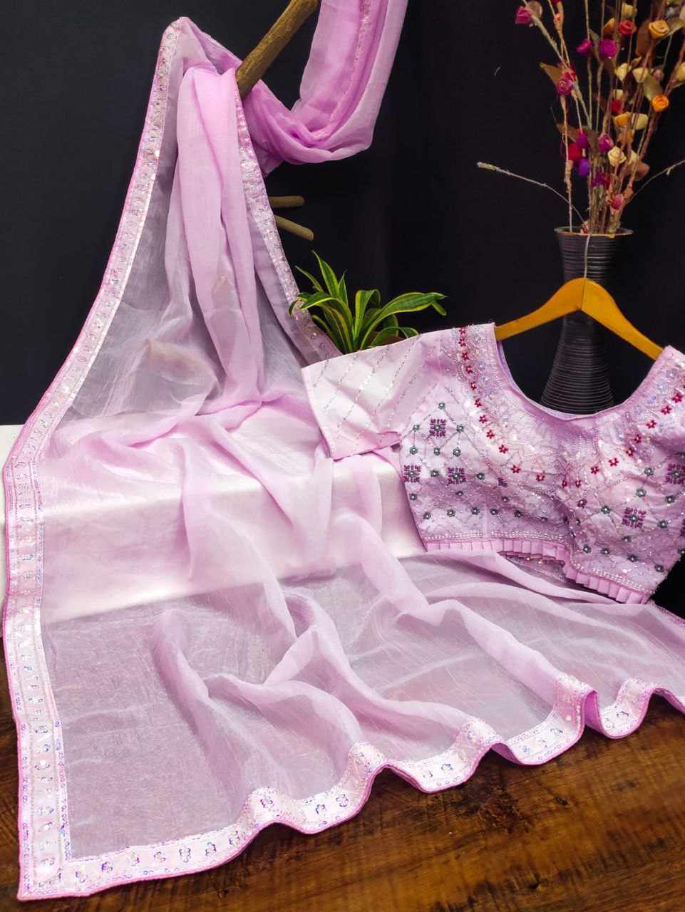 Saree Fabric: Beautiful crush shining saree with beautiful heavy handwork with beautiful rainbow sequins attached VALMOTI lace on the saree.