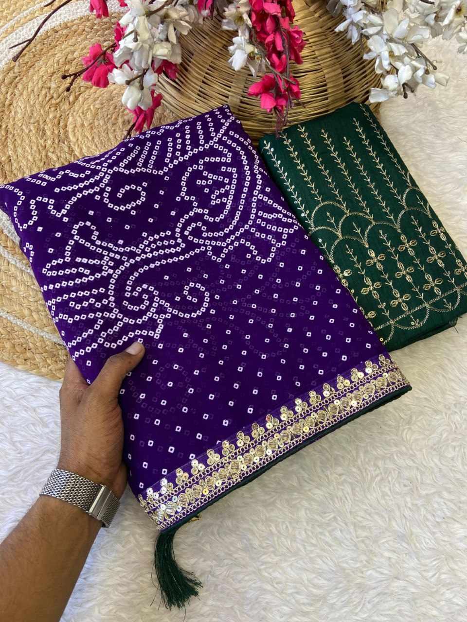 | Name : | RC Purple Bandhej Georgette heavy Coding Sequence border Saree |