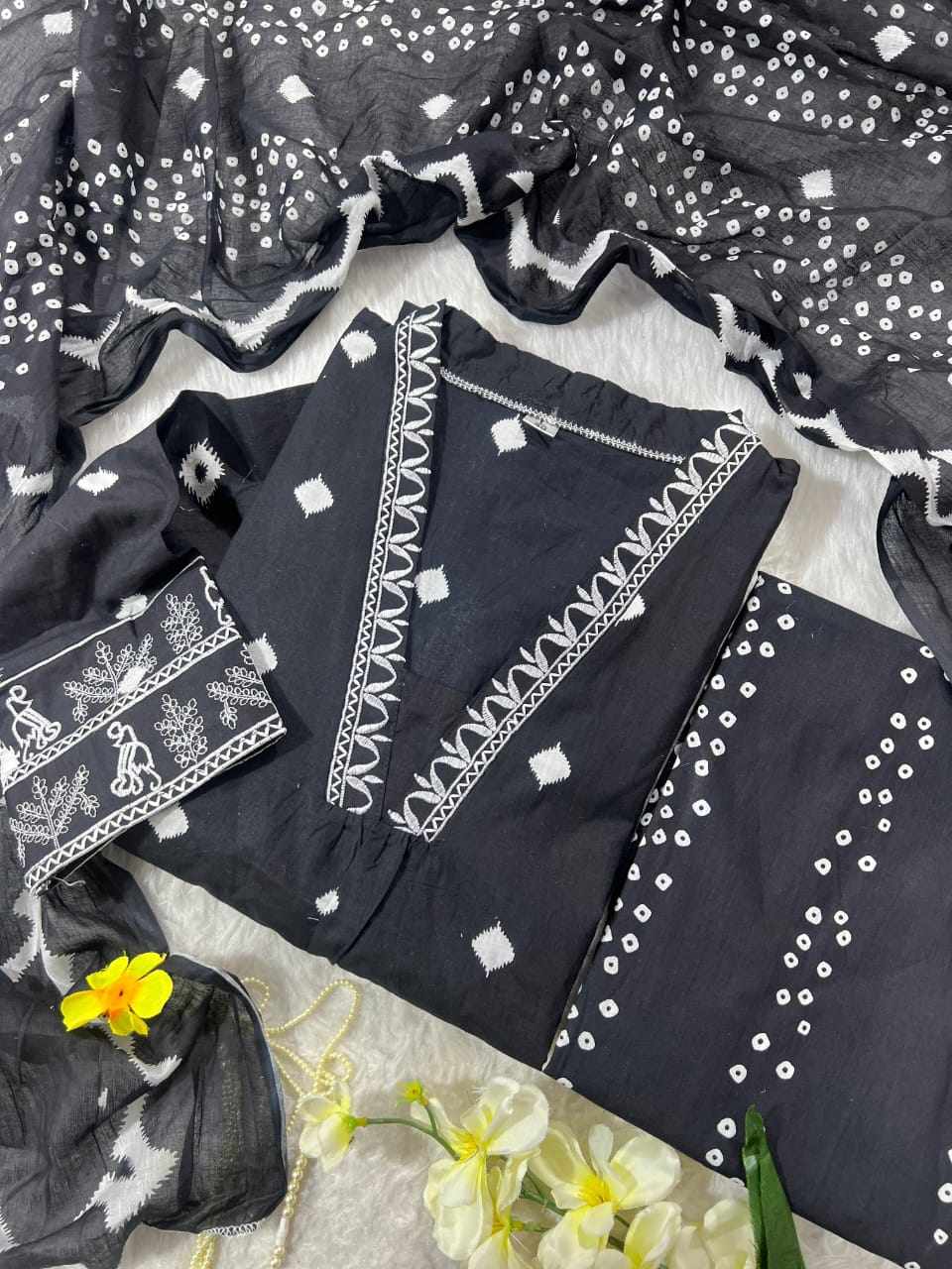 Cotton Kurti with white thread embroidery work on neck and matching Pant and malmal cotton