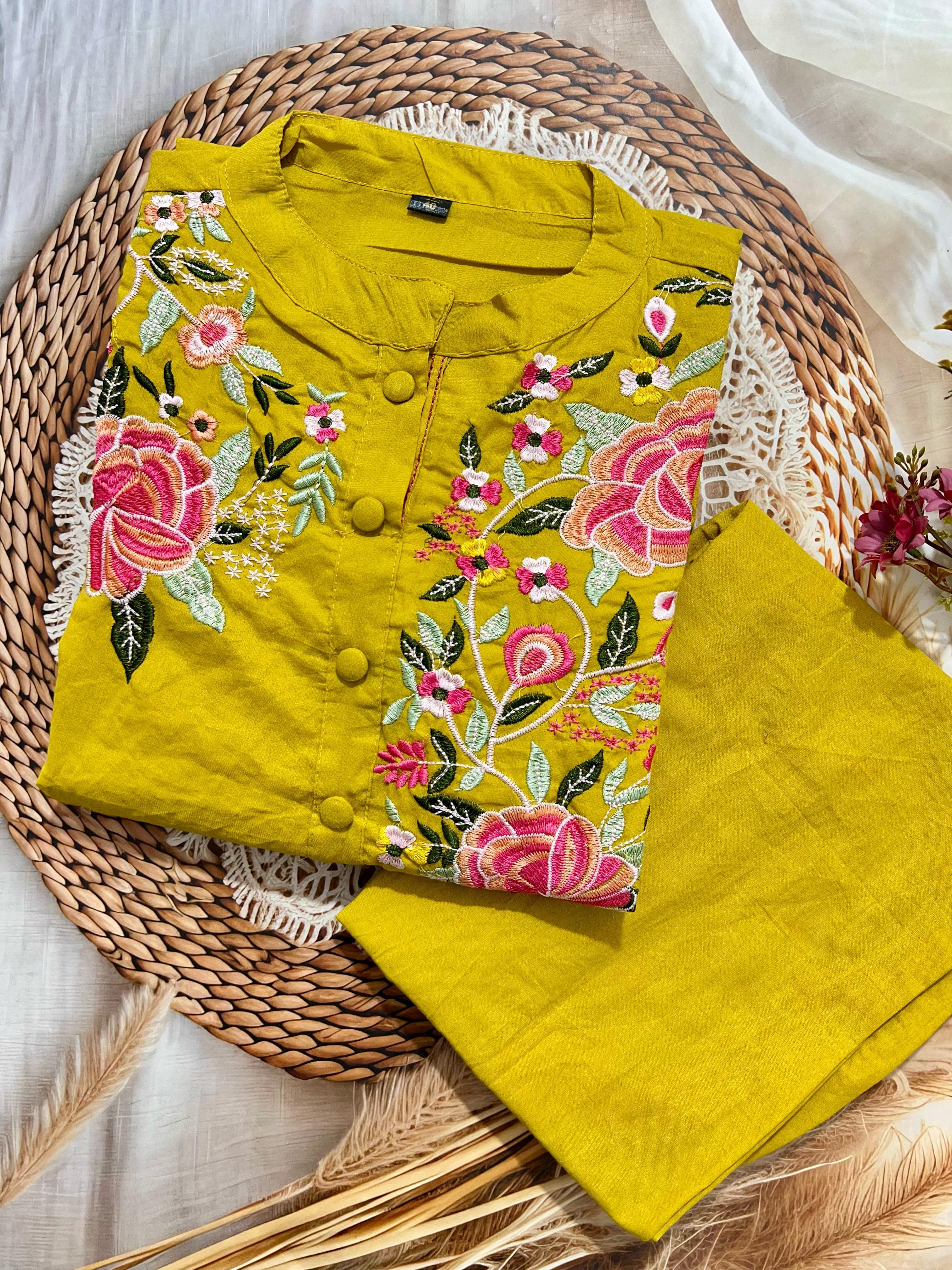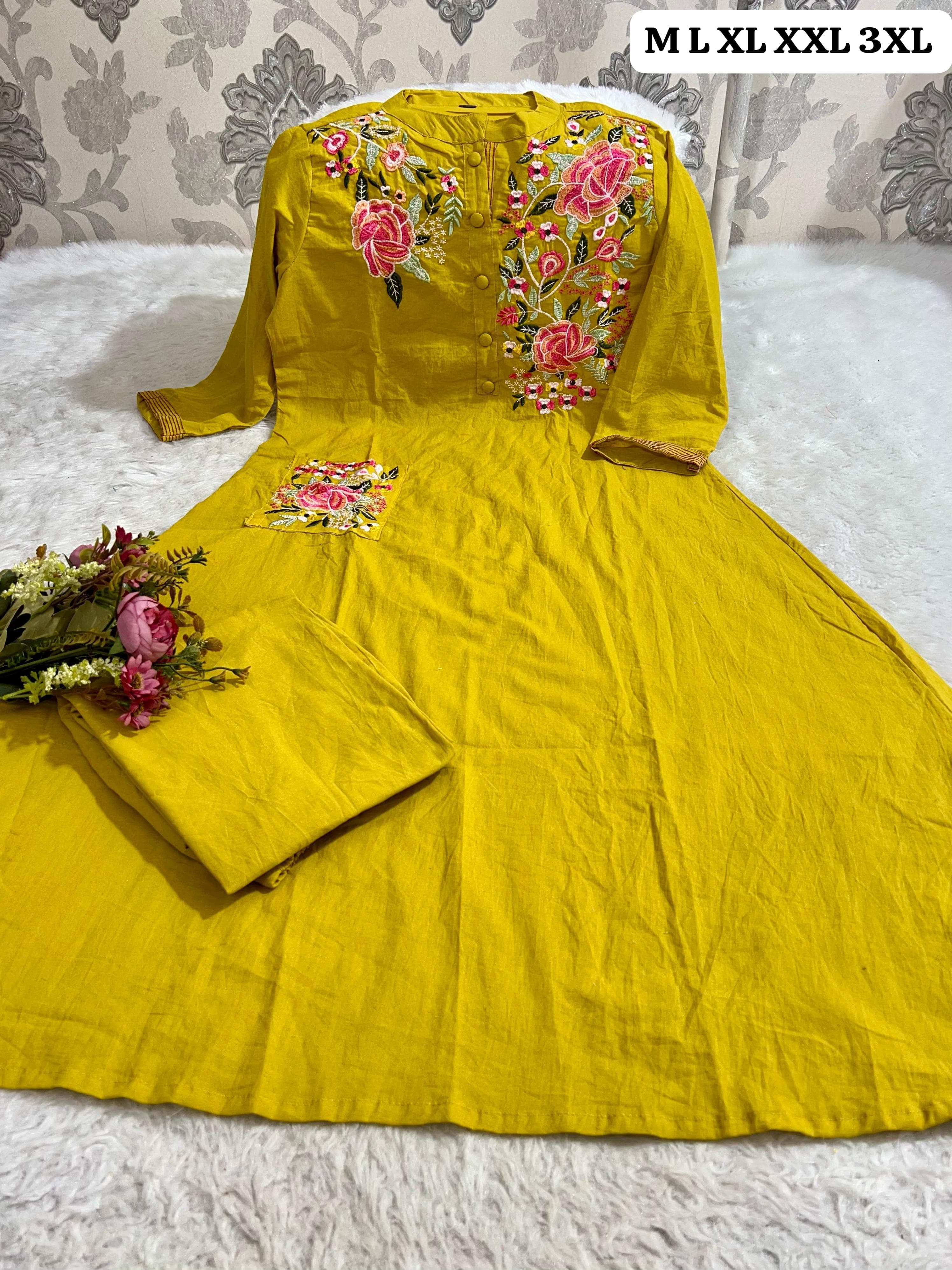 SF 3JU Yellow Pure fine Cotton fabric Embroidery Work Kurti with Pant has been successfully added to your cart .